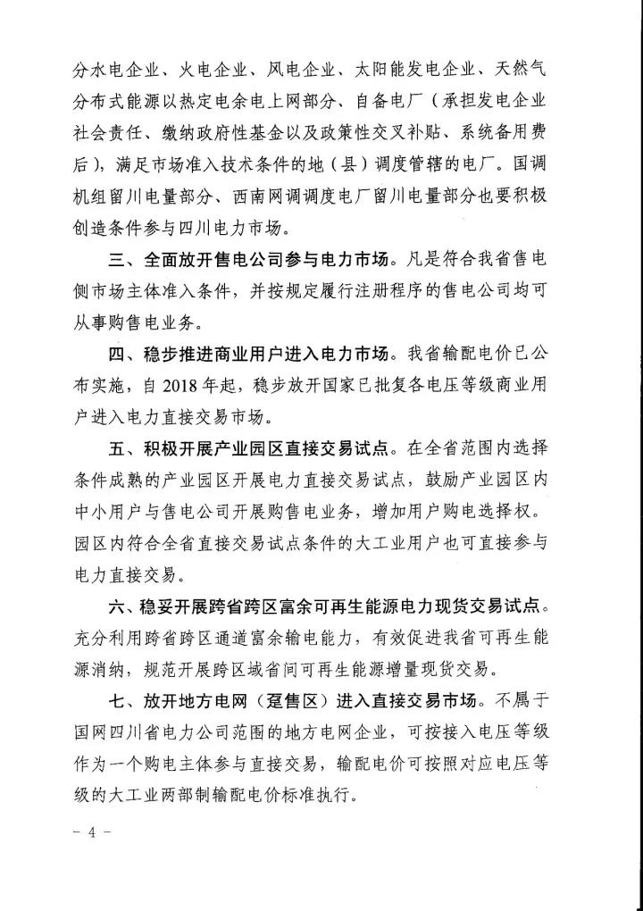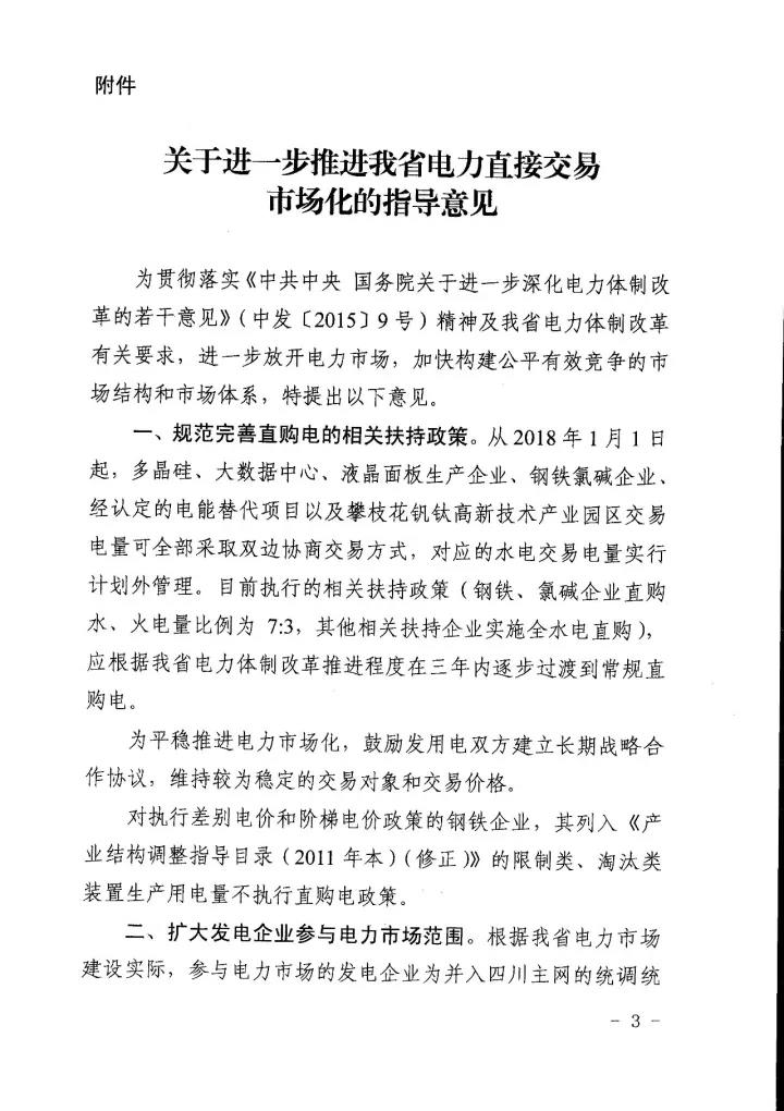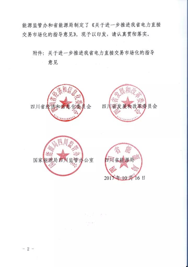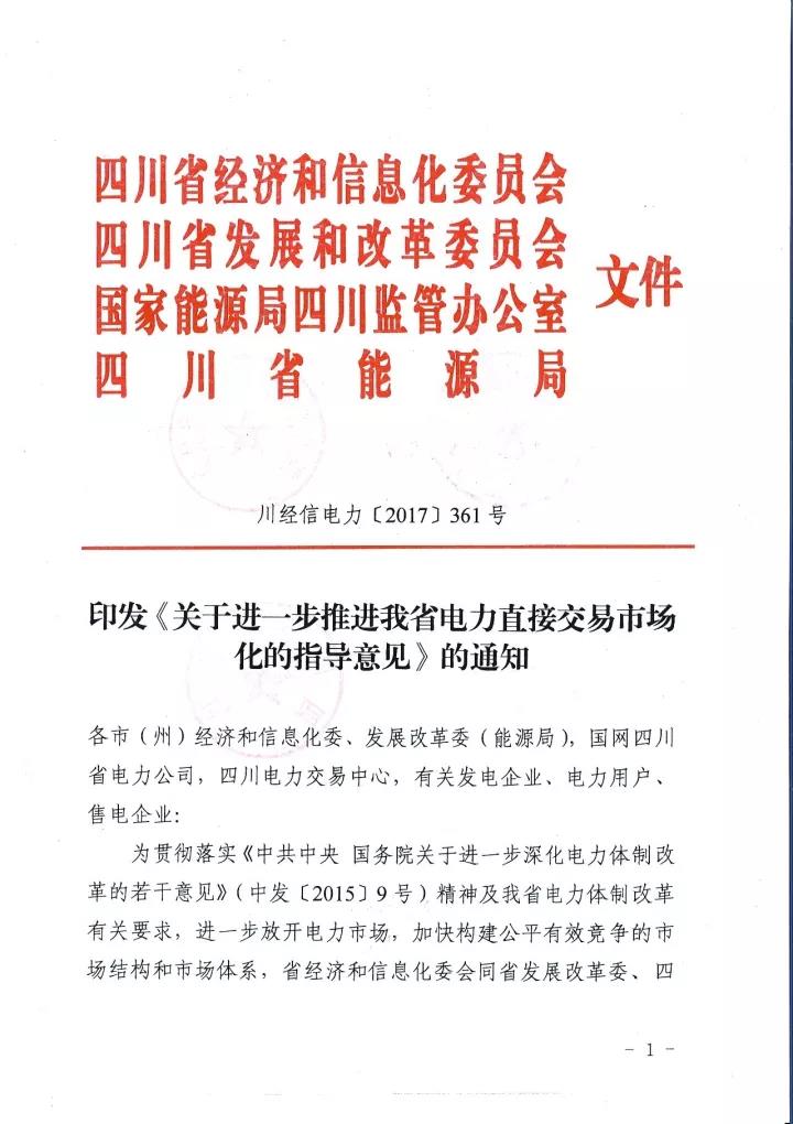 四川省經信委、四川省發 改委、國家能源局四川監管辦、四川省能源局日前聯合下發了《關于進一步推進我省電力直接交易市場化的指導意見》(以下簡稱“意見”)。意見中稱,將規范完善直購電的相關扶持政策,擴大發電企業參與電力市場范圍,全面放開售電公司參與電力市場,穩步推進進商業用戶進入電力市場,積極開展產業園區直接交易試點,穩妥開展跨省跨區富余可再生能源電力現貨交易試點,放開地方電網(躉售區)進入直接交易市場,有序推進其他特殊行業企業完全電力市場化。詳情如下: