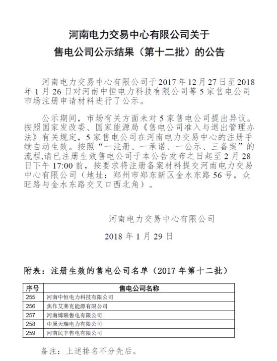 日前,河南電力交易中心發(fā)布了關(guān)于售電公司公示結(jié)果(第十二批)的公告,公告中稱,于2017年12月27日至2018年1月26日對河南中恒電力科技有限公司等5家售電公司注冊申請材料進行了公示,未收到異議,注冊手續(xù)自動生效。