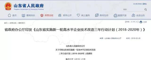 日前,山東省印發了《山東省實施新一輪高水平企業技術改造三年行動計劃(2018-2020年)》(以下簡稱“行動計劃”)。旨在充分發揮企業技術改造在推動工業轉型升級中的重要作用,促進全省企業技術改造向更廣領域更高水平發展,加快推進工業領域新舊動能轉換,實現制造強省建設目標。